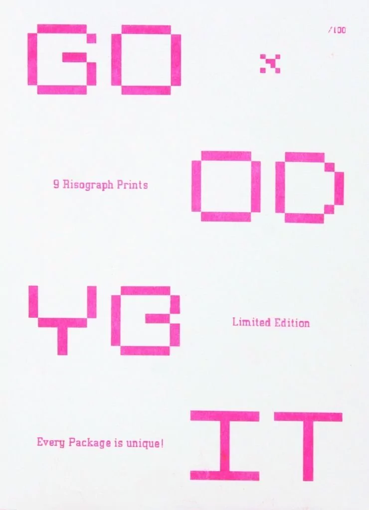 Goodybit é um coletivo de design baseado em Londres. Partindo de manchetes de jornal como inspiração, cada arte foi criada em 8 bits em um mac de 1984, em 2014. Cada envelope de art prints é único e limitado em 100 edições, contendo 9 impressos sortidos em risografia.