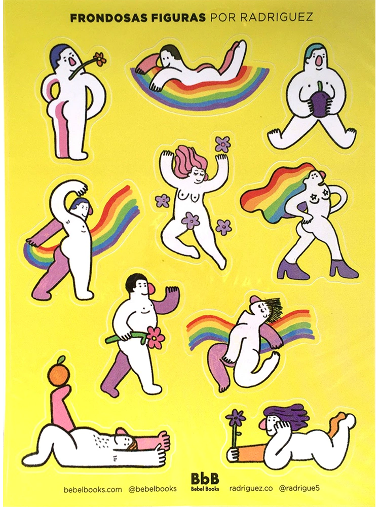 Cartela de adesivos com personagens criados pelo artista mexicano Radriguez por ocasião da Parada Gay 2019 em SP e da pintura da fachada do El Cabriton.